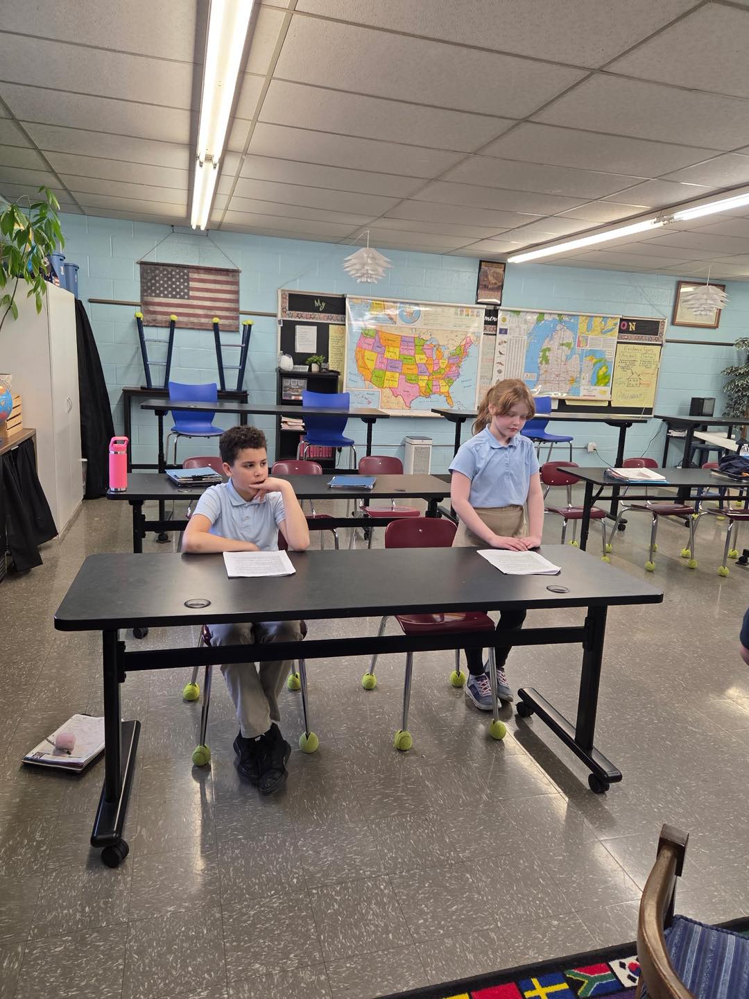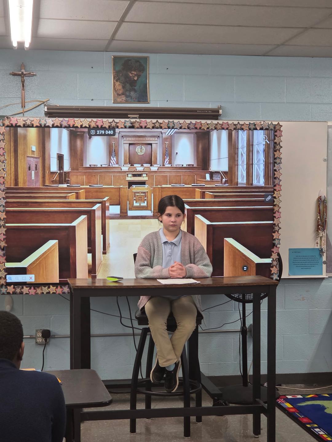 As part of their study on justice, students stepped into the roles of attorneys, witnesses, jurors, and judges. They examined evidence, presented arguments, questioned witnesses, and worked together to reach a verdict.