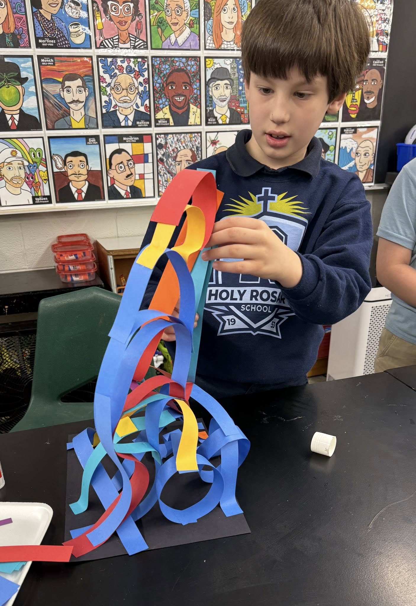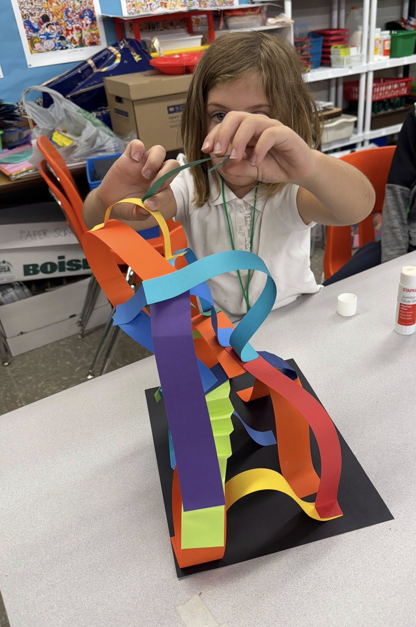 They explored the element of FORM by transforming flat 2D paper strips into eye-popping 3D paper sculptures! From twists and curls to arches and springs, their creativity popped off the page — literally!