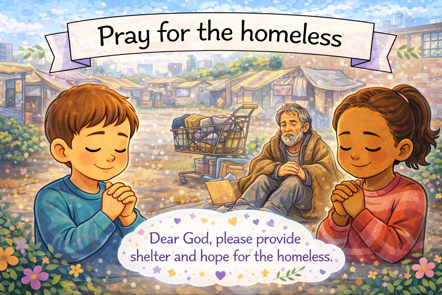 Take a moment to ask God to bless them with protection, warmth, food, and caring people to support them. 💕 You might also talk as a family about small ways to help, such as donating items or supporting a local shelter.